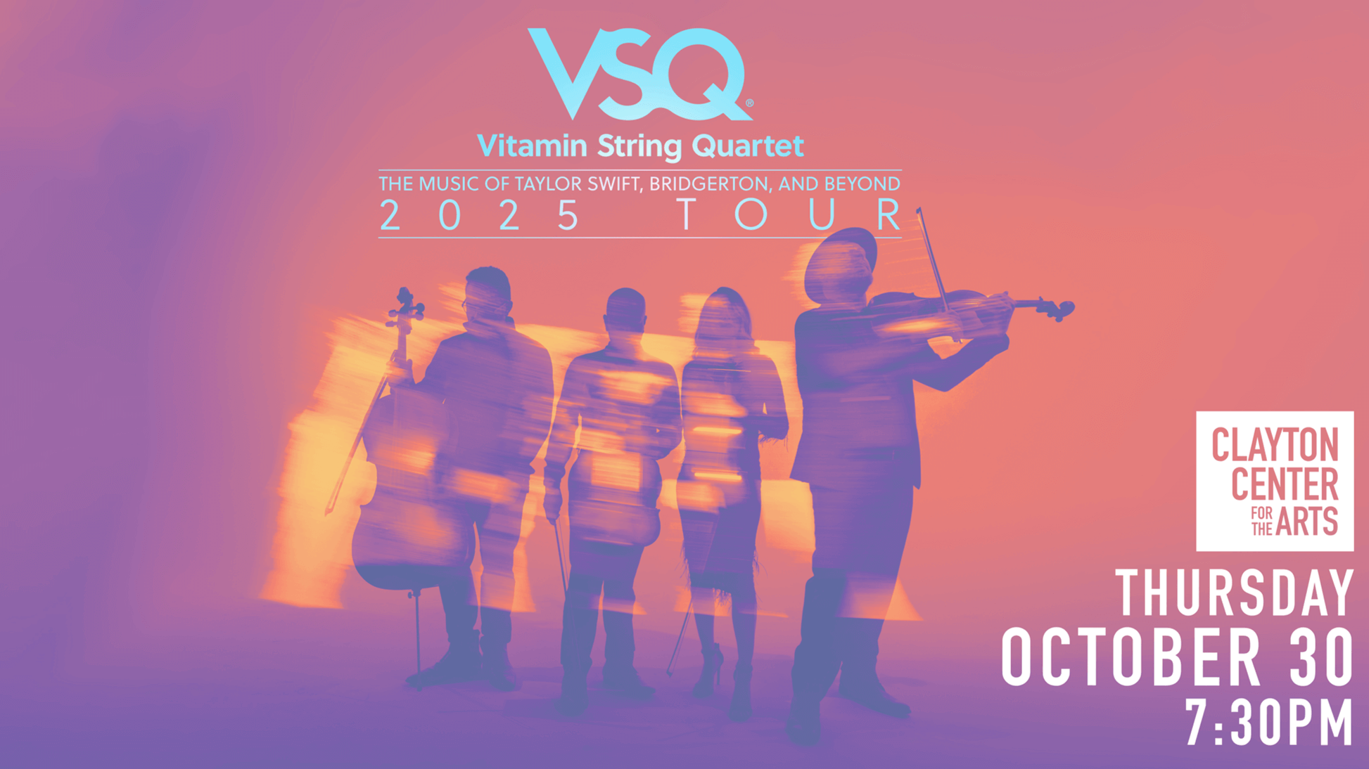 CCA - Ronald and Lynda Nutt Theatre 502 E Lamar Alexander Pkwy, Maryville, TN, United StatesClayton Center for the ArtsLong before Bridgerton broke the Netflix algorithm, Vitamin String Quartet (VSQ) had helped establish classical crossover as a genuine force in contemporary music. Fresh off high-profile placements in Seasons 1 and 2 of the aforementioned streaming smash, VSQ has “reached a mainstream, global audience” (Variety) and “charmed the world with their classical covers” (Nylon). New…