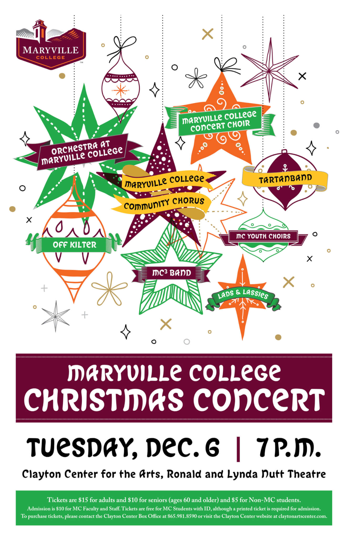 The Maryville College Christmas Concert will take place at 7 p.m. Tuesday, Dec. 6, at the Clayton Center for the Arts on the MC campus and is open to the public. Tickets are $15 for adults; $10 for seniors and Maryville College faculty and staff; $5 for non-MC students; and free for MC students with ID.