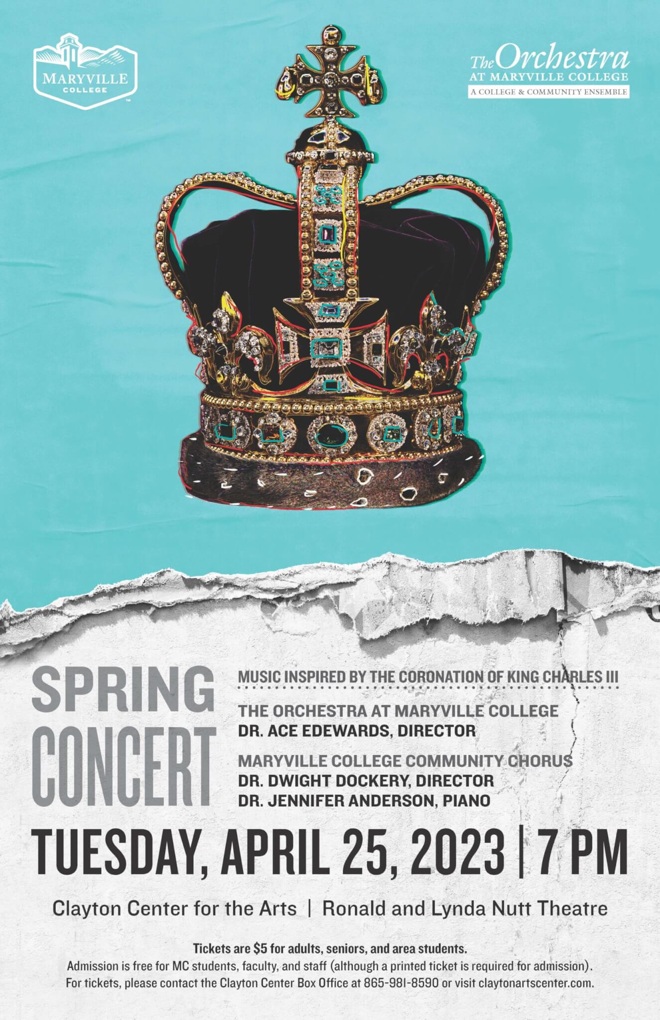 According to Dr. Ace Edewards, conductor of the Orchestra and Maryville College; and Dr. Dwight Dockery ’05, conductor of the Maryville College-Community Chorus, the combined musicians of those two organizations will come together to celebrate music inspired by the coronation of the new English king. The concert will take place in the Clayton Center for the Arts on the MC campus.