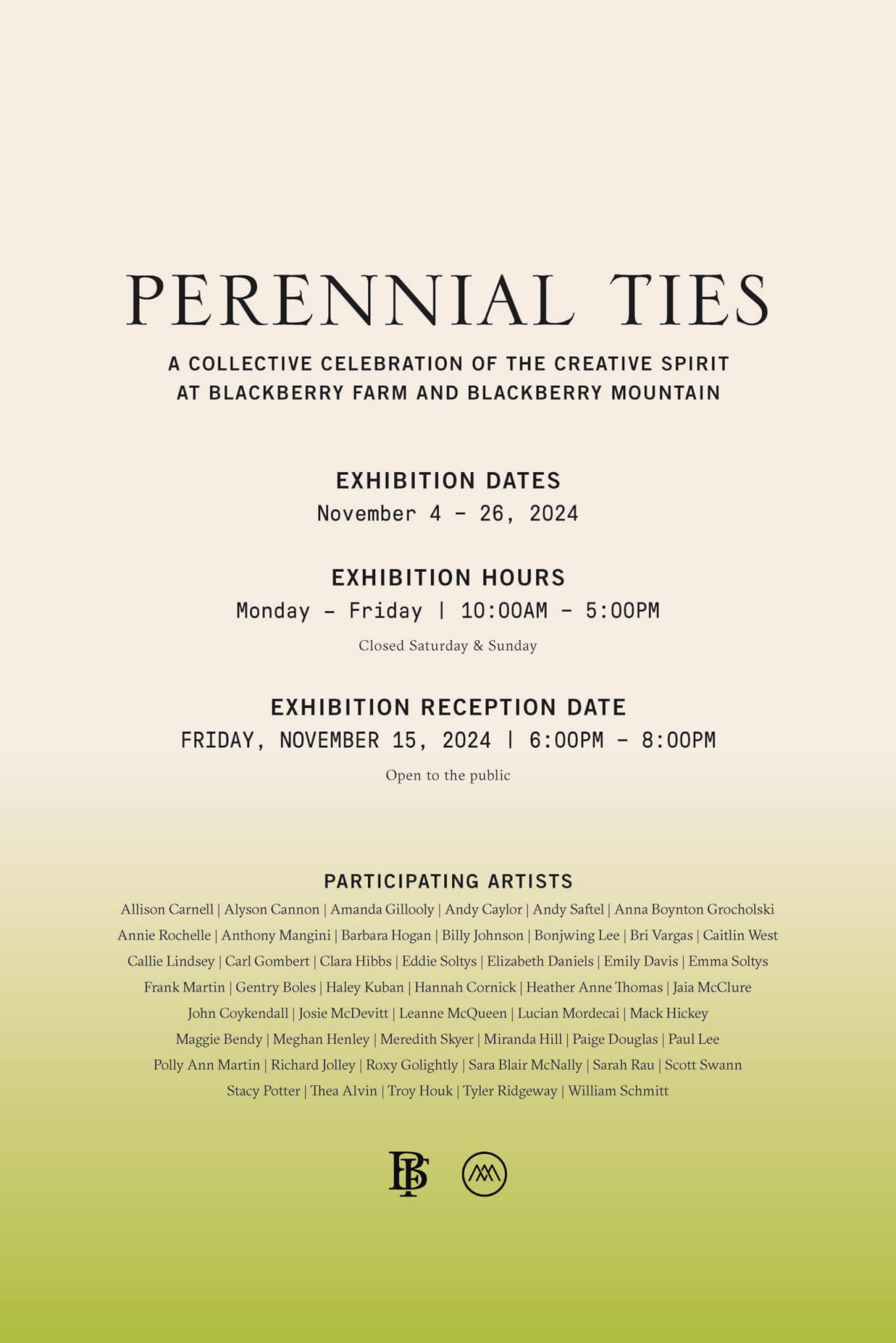 From 6-8 p.m. Friday, Nov. 15, the Clayton Center for the Arts will host a public reception for its current exhibition, titled “Perennial Ties: A Collective Celebration of the Creative Spirit at Blackberry Farm & Blackberry Mountain.” This exhibit is on display through Nov. 26 in the Blackberry Farm Gallery in Building B of the Clayton Center.