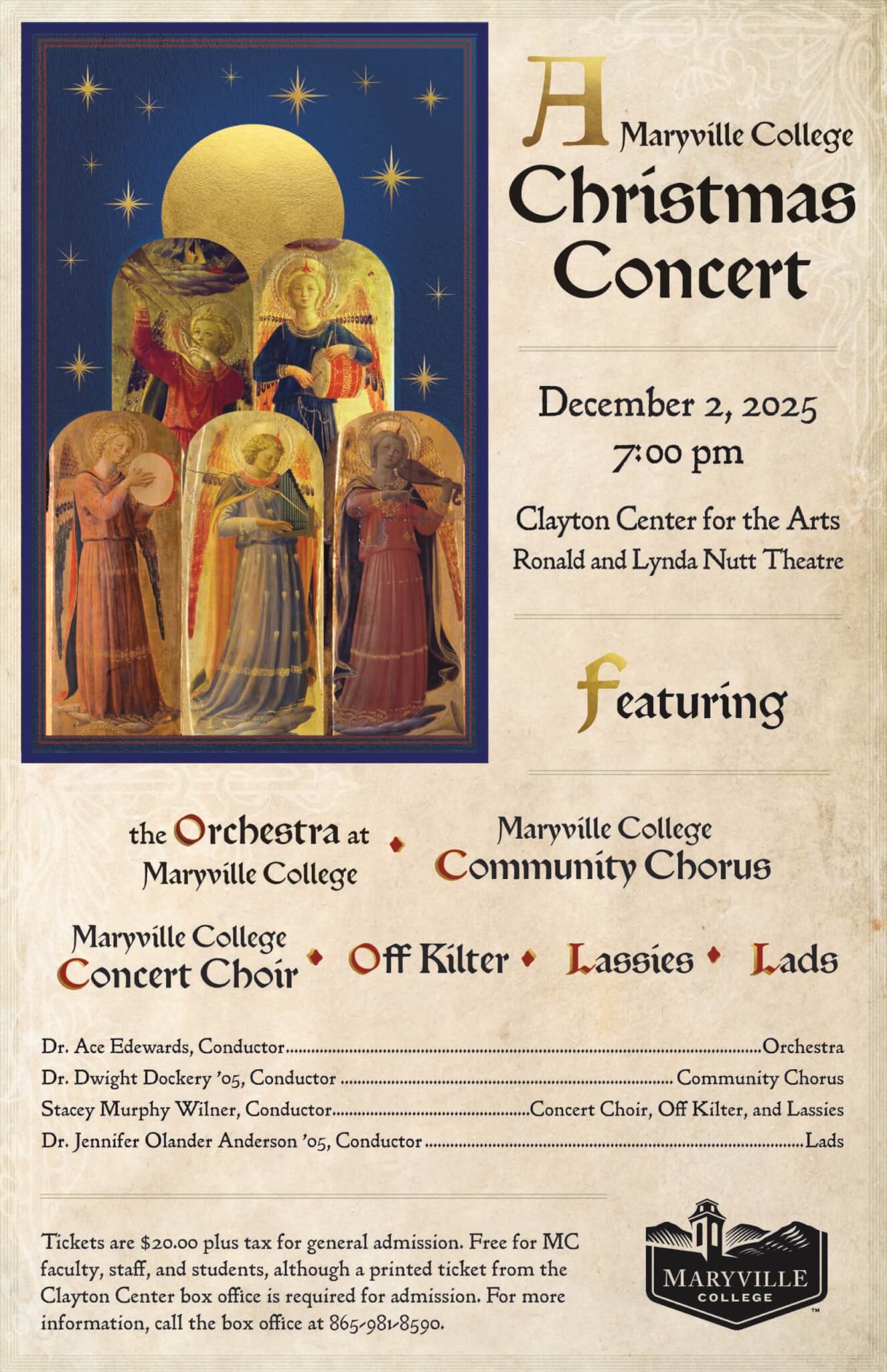 Tickets are $20 plus tax for general admission and free for MC faculty, staff, and students, although a printed ticket from the Clayton Center box office is required for admission. For more information, call the box office at 865-981-8590.