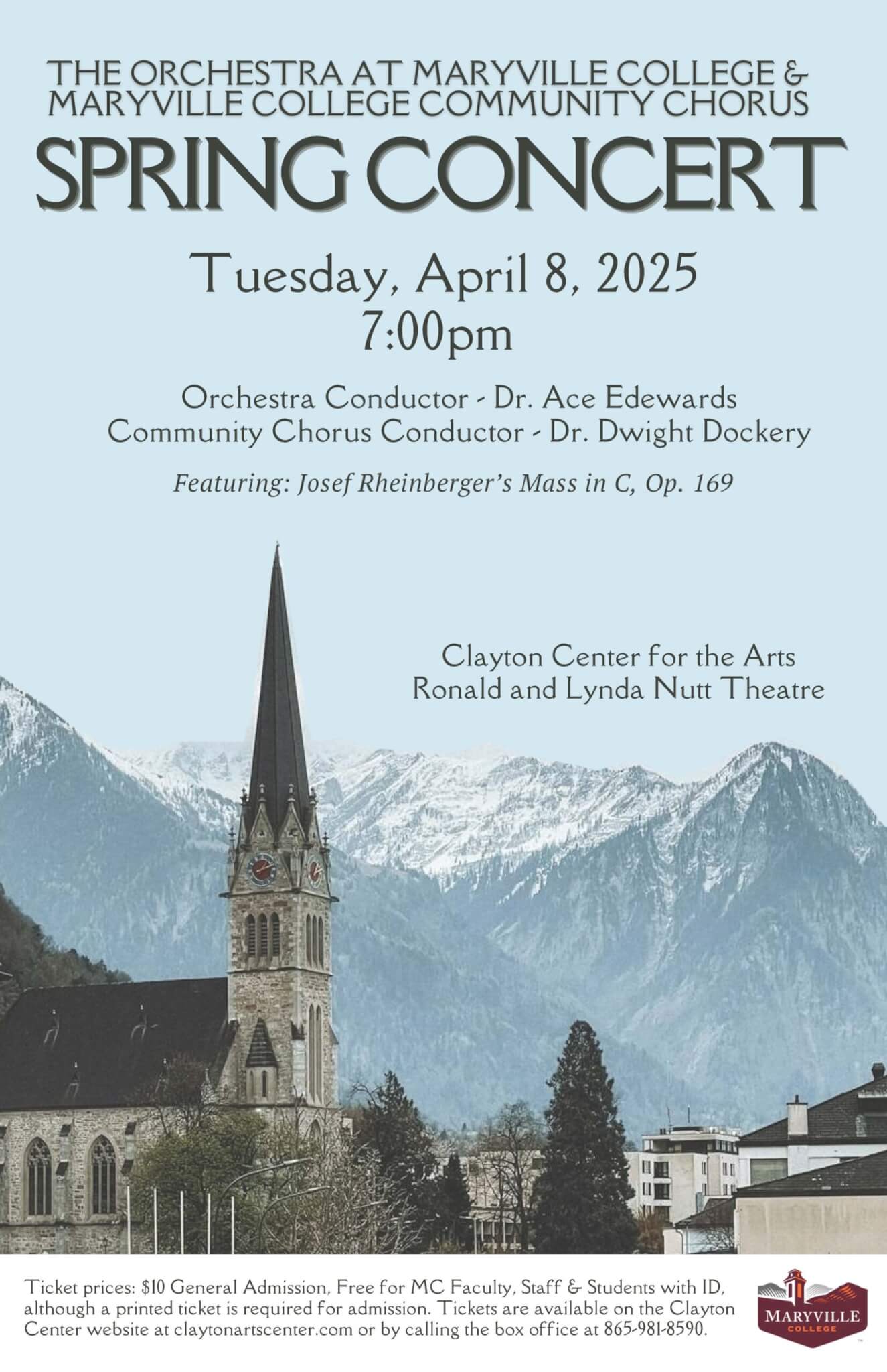 Poster for the Maryville College spring concert by the Orchestra at MC and the MC Community Chorus